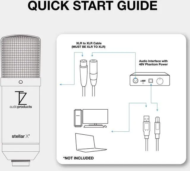 NOTE: To connect to a computer, please use an audio interface with 48V phantom power and an XLR to XLR cable.