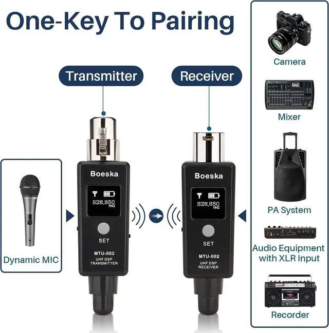 Designed for Dynamic Microphone and Instrument: Come with 6.35 mm xlr adapters, you can connect the with XLR transmitter and receiver. They work with any dynamic microphone, guitar, audio mixer, PA system, providing stable and reliable wireless transmission