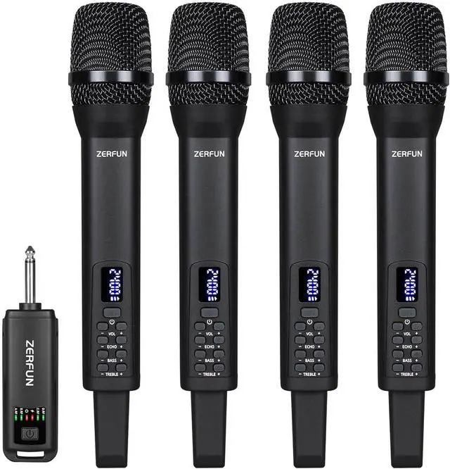 Here are four ZERFUN rechargeable wireless microphones! They are equipped with independent controls for volume, echo, treble, and bass. They are the perfect choice for home karaoke, meetings, parties, churches, DJ events, weddings, and so many more applications! These well-made cardioid wireless mics have the ability to pick up noise unidirectionally(Only when we speak towards the top of the microphone will there be a sound, while there will be no sound when speaking on the side). With this pickup pattern, the directional vocals can be effortlessly separated from the background noise.