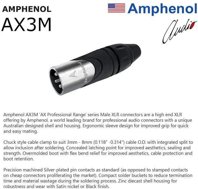 We use the highest-grade, premium Amphenol XLR connectors in this assembly for the ultimate value. AX3M & AXX3F are high end XLR offerings by Amphenol, the AX (Professional) series has great reliability, improved contact integrity & reduced cable strain. The connectors come in a Satin Nickel finished Zinc diecast Shell, Silver-plated contacts, & the AX3M has Machined contacts for superior performance (as opposed to stamped contacts on cheap connectors proliferating the market).