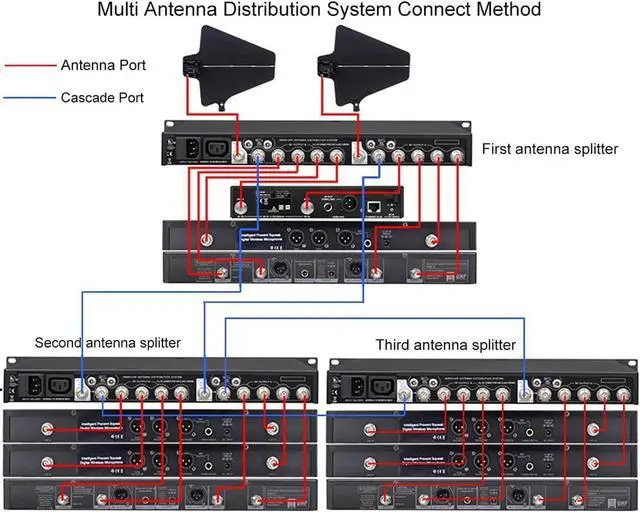 Expansion Capability8 Outputs + 2 Cascade Ports,It supports 5 units 2-antenna wireless microphone receiver or 2 units 4-antenna wireless microphone receiver and 1 units 2-antenna wireless microphone receiver
