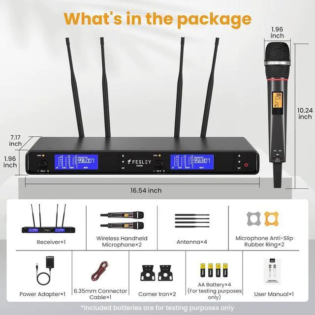 Box Content: 1 x UHF wireless receiver, 2 x handheld wireless microphone, 1 x user manual, 1 x power adapter, 1 x 6.35mm audio cable, 2 x anti-rolling ring, 4 x AA battery, 2 x Corner lron, 2 x Antennas. (Note: This product does not support Bluetooth connect.)