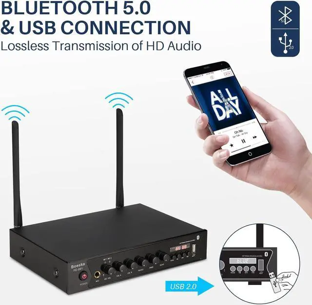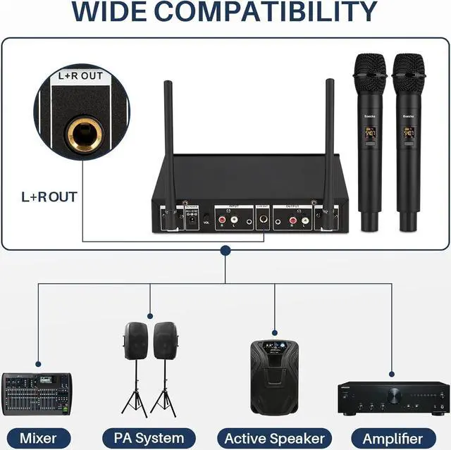 Compatible Connection: Phone and pad can play music with the wireless microphone system when the output is connected to amplifier / active speaker. USB connection is also supported by the receiver