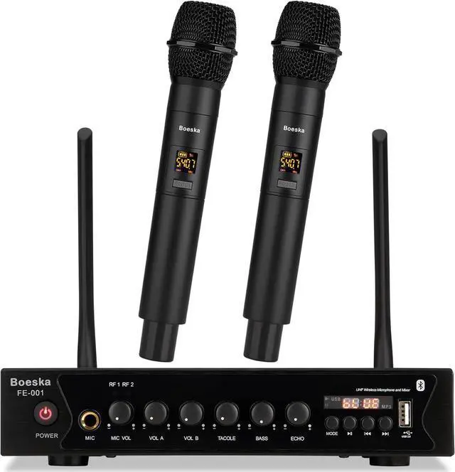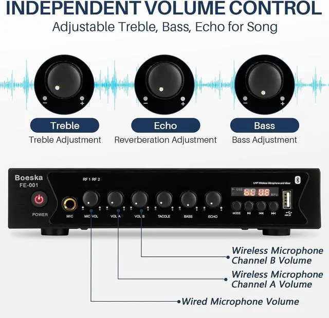 Diversified Sound Adjustment: The wireless microphone receiver has separate Treble, Bass, Echo control knob for each mic. So you can choose different microphone sound effects according to different songs. You will look like a super singer when you singing