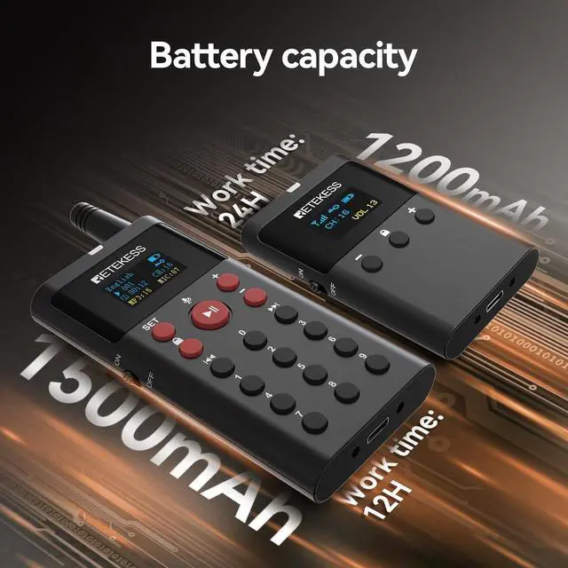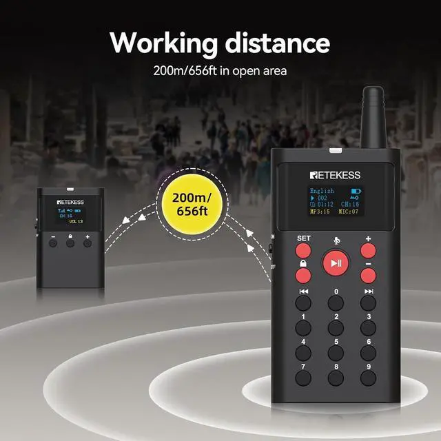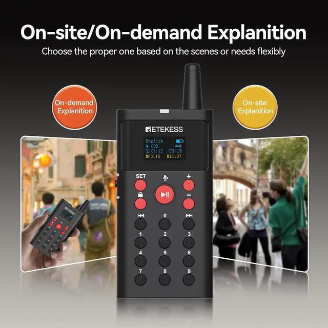 Large-capacity memory card; the Retekess TT127 tour guide system has a 16GB memory card that can pre-store recorded MP3 audio files; through manual on-demand playback, multi-functional tour guide machines in the same group can simultaneously listen to the pre-recorded audio files wirelessly