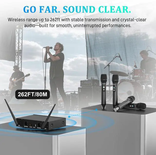 Stable UHF Transmission Provides clear, interference-free sound with an operating range of up to 262 ft (80 m) in open areas, ensuring reliable performance during activities.