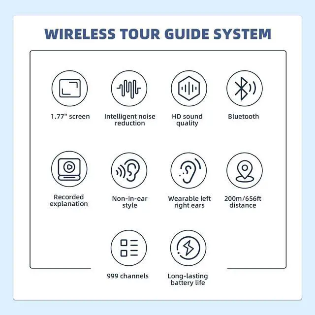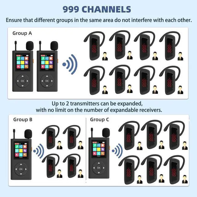 Extremely long working range Tour guide speaker transmission distance of the tour guide system in open areas can reach 200m/656ft. It contains 999 channels to ensure that different groups will not interfere with each other in the same area;