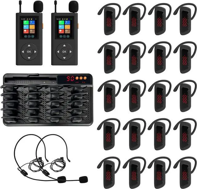 Easy to carry The wireless tour guide system includes 2 transmitter and 20 receivers, 4 * microphones (2 * head-mounted mic and 2 *upright mic can be used for different purposes), and a 21-card slot charging base for easy charging and storage.