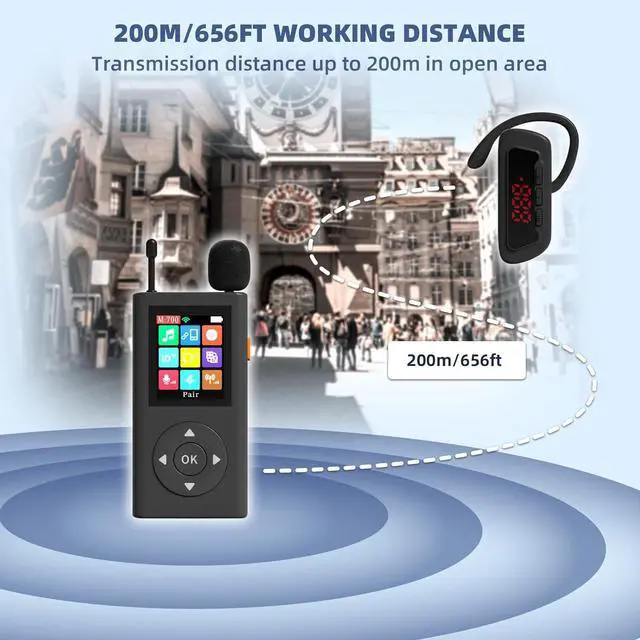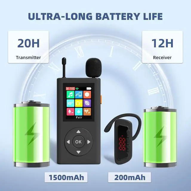 Long-lasting Battery LifeThe transmitter has a built-in 1500mAh battery, which can last for about 20 hours when fully charged, The receiver features a 200mAh battery, providing around 12 hours of continuous use. Perfect for all-day tours or training sessions, and you dont have to worry about the low battery of the tour guide midway.