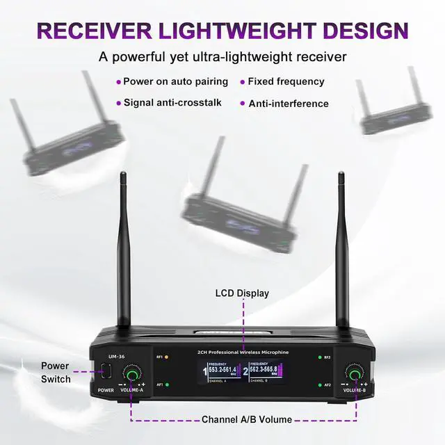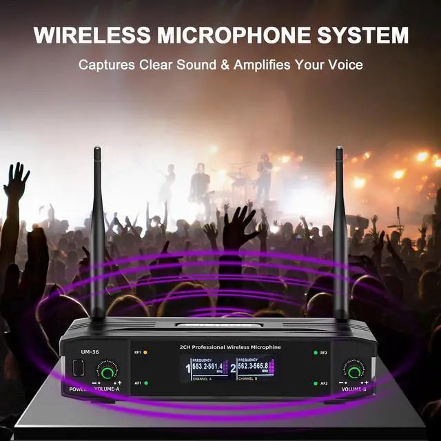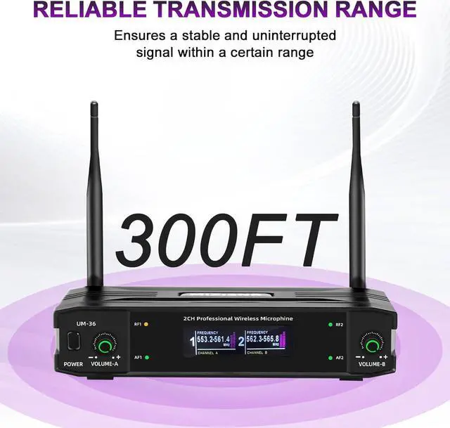 STABLE WIRELESS PERFORMANCE: Featuring advanced wireless transmission, this dual-channel microphone system ensures quick pairing and consistent, interference-free signals. With a reliable range of up to 300ft/90m, performers can move with confidence on stage.