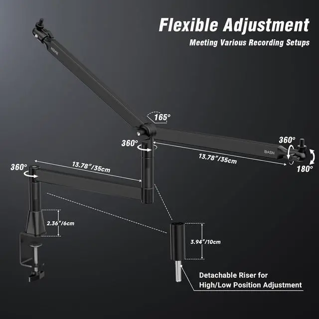 Dual-Arm Precision Positioning System: Master any recording scenario: Combine the 13"-28" extendable boom arm with the detachable 3.94" (10cm) lift rod for 360° positioning freedom. Transition seamlessly between seated streaming and standing vocal sessions without re-clamping your mic stand desk.