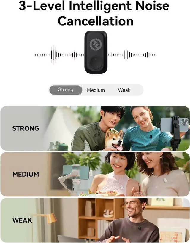 3-Level Intelligent Noise Cancellation: Hollyland Lark A1 Wireless Microphones with adaptive noise reduction (Weak/Medium/Strong) filters wind, traffic, and room echoesideal for wireless microphones users filming outdoors, live streams, or podcasts