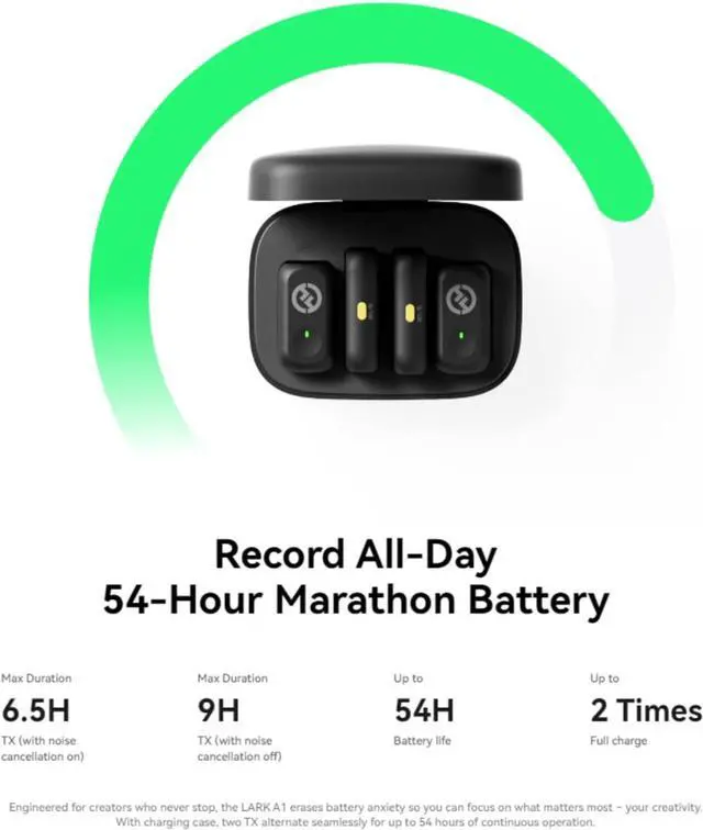 Up to 54h Battery Life: Hollyland Lark A1 mic erases battery anxiety so you can focus on what matters most your creativity. With charging case, two TX alternate seamlessly for up to 54 hours of continuous operation