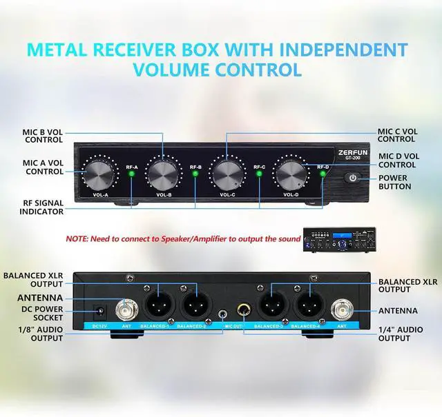 4 CHANNEL PRO RECHARGEABLE WIRELESS MICROPHONE SYSTEM: ZERFUN GT-200 UHF Wireless Microphone System Professional that comes with four handheld metal cardioid rechargeable microphones and metal receiver box with with Independent Volume Control, 4x50 Adjustable Frequency, 1/8, 1/4, XLR Output. Perfect for home karaoke, meeting, party, church, DJ, wedding, and much more.