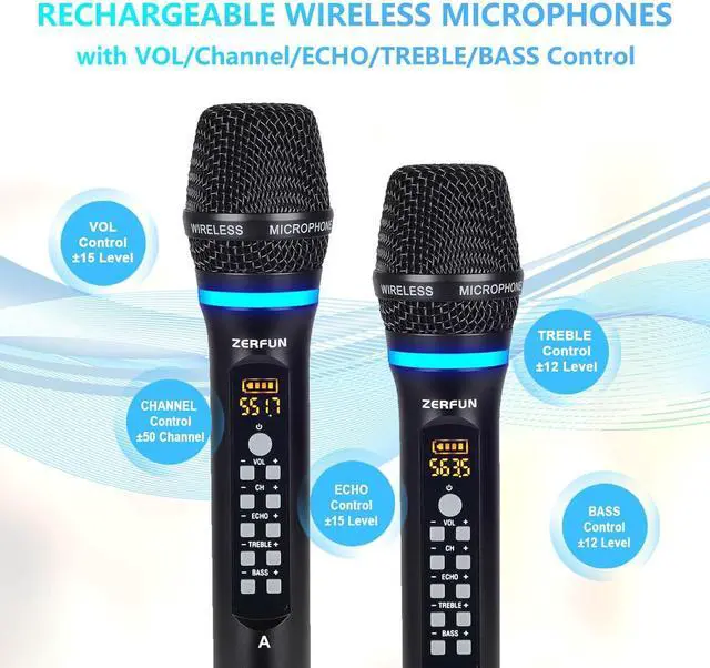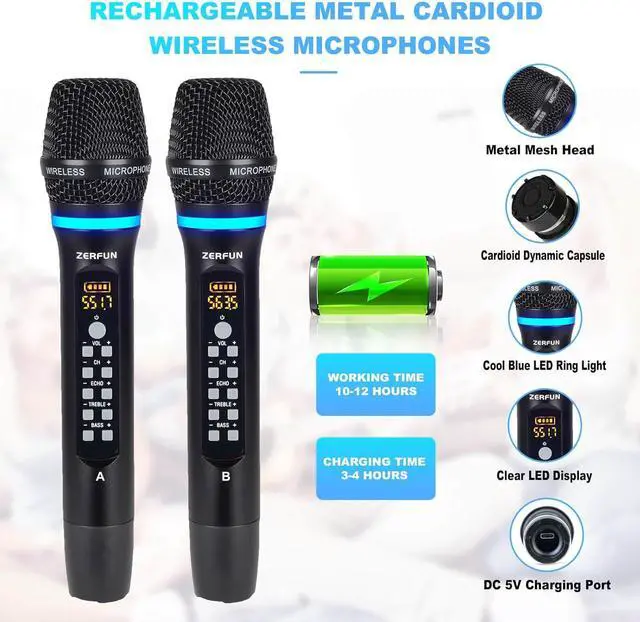 HANDHELD CORDLESS MICROPHONES: ZERFUN Rechargeable Wireless Microphones with independent Volume, ECHO, Treble, BASS, Channel Control. They are well-made metallic cardioid wireless mics which means they pick up noise unidirectionally(Only when we speak towards the top of the microphone will there be a sound, while there will be no sound when speaking on the side). With this pickup pattern, the directional vocals are easy to isolate from background noise.