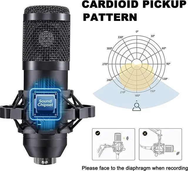 Wonderful Voice Quality Studio Equipment Microphone for podcast is equipped with upgraded sound chipset that offers a wide frequency response and can capture your voice in more detail. High signal-to-noise ratio of studio microphone for podcast can greatly decrease distortion. Cardioid pickup of streaming microphone can isolate redundant ambient noise. Strong metal arm stand of recording microphone can buffer ambient vibration and reduce noise of shock.