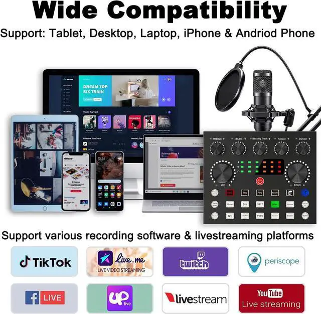 Professional Podcast Equipment Bundle This podcast microphone bundle is born for recording, podcasting, live streaming on YouTube, TikTok, etc. podcast equipment bundle contain a condenser microphone, you can start podcasting easily after plugging audio interface into smart phone or PC. This podcast equipment bundle can meet almost all your needs and it is unnecessary to buy other podcast kit again.
