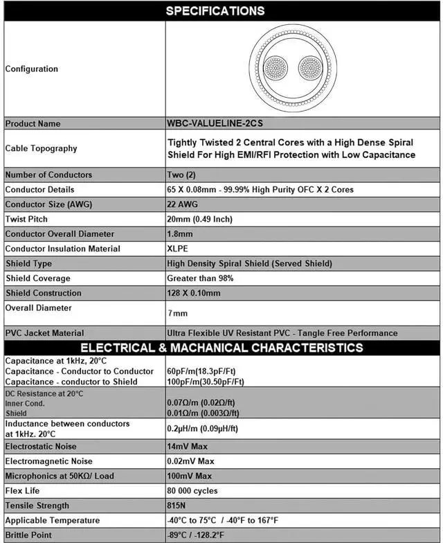WBC-VALUELINE-2CS (22 AWG) is a Low-Capacitance, 22AWG Microphone, Active-Speaker & Interconnect cable. Result of years of rigorous R&D, the 2CS boasts a UV-protected jacket, a dense spiral shield, an XLPE sub-shield & two, 22AWG 99.99% Oxygen Free Copper cores made out of 0.08mm Ultra-fine strands. Excellent shielding cancels out all EMI & RFI, this Road-ready cable will encounter, resulting in a pure signal transmission. The Flexible, Tangle-Free jacket makes the cable extremely user-friendly.