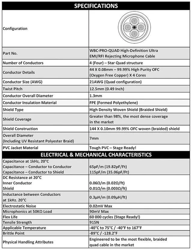 WBC-PRO-QUAD is truly the Most-Silent & the Most-Flexible Star-Quad cable in the market & boasts a tough UV-protected outer jacket, a dense braided shield (above 98% coverage) & four, 0.08mm Fine-Stranded 99.99% Oxygen Free Copper cores totaling to 21AWG. Excellent shielding coupled with the Star Quad design totally cancels out all EMI & RFI this stage-ready cable would encounter, resulting in the purest form of signal transmission. Superior to industry leaders like Mogami's 2534 & Canare's L-4E6S.