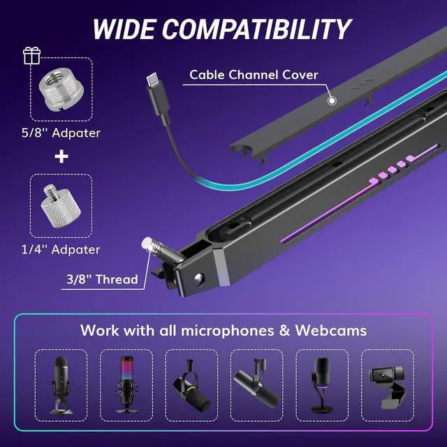 Strong Compatibility: The RGB boom arm features a 3/8'' thread and includes adapters for 5/8'' and 1/4'', making it compatible with most microphones and webcams; the upgraded desk clamp fits desks up to 2.36'' (6cm) thick, so you can buy with confidence