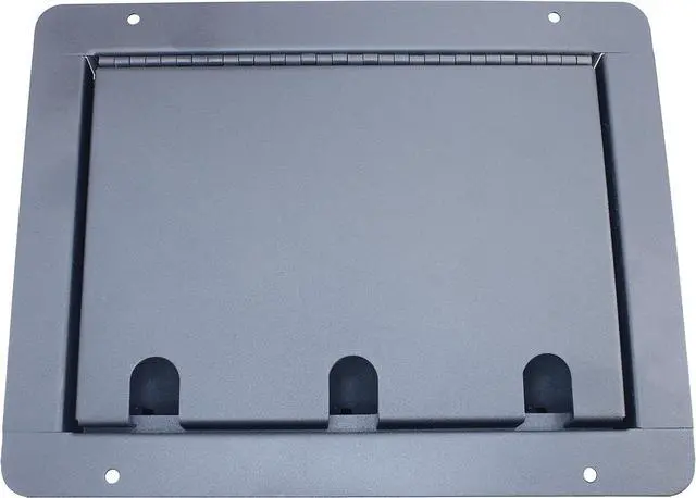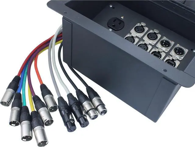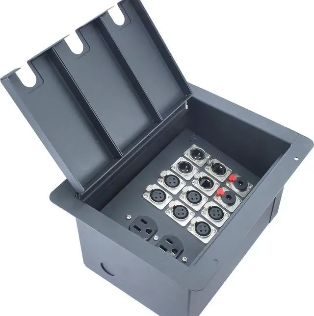 Sturdy 14ga Steel Construction Hinged Lid With Cable Access Metal Insert Dimensions: 8.25" x 6" Great for cleaning up your stage Audio connections are prewired with 18" inch leads for easy hookup