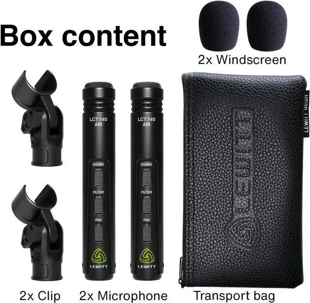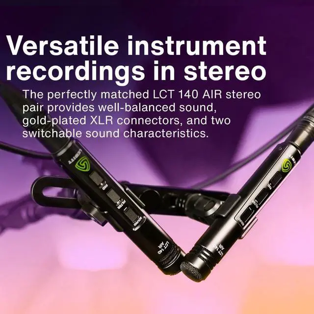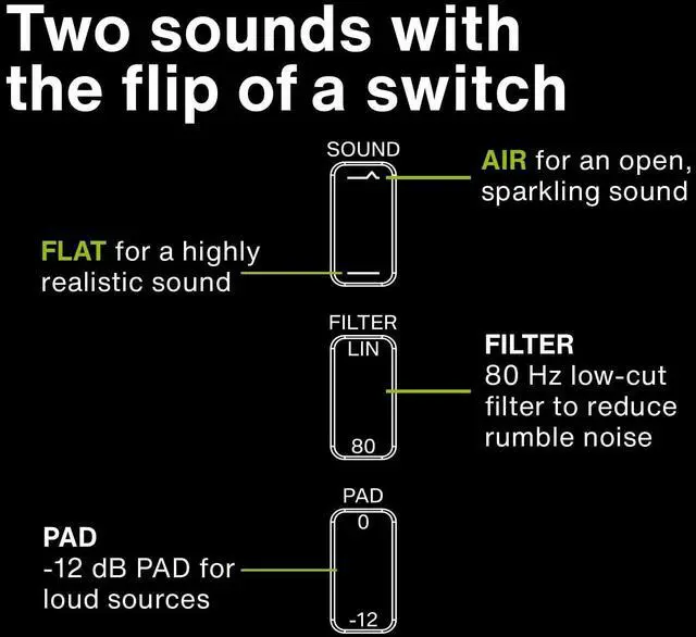 Two switchable sound characteristics, AIR and FLAT The best stereo matching you can get Excellent transient response and full flexibility on all instruments Durable and light aluminum housing Made for acoustic instrument recording