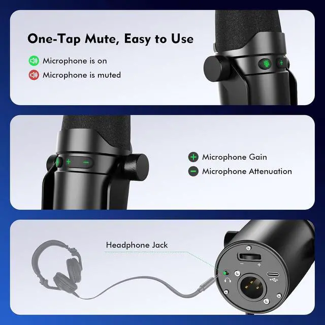 Simple Mute and Gain Adjustment: You can control mute with a single press of the one-touch mute button, and the operation is quiet without unnecessary noise. Meanwhile, the gain knob on the podcast recording microphone allows you to adjust the input volume, enabling the output of more vivid broadcast-grade audio