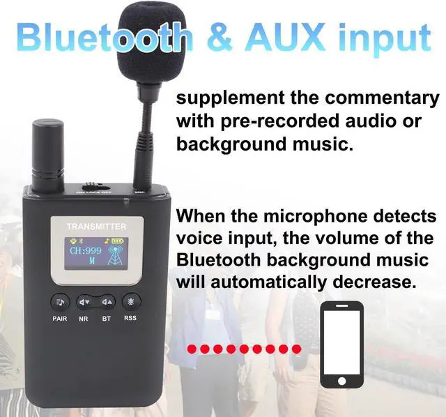 Bluetooth function: The transmitter can connect to other devices such as phones via Bluetooth to play background music or pre-recorded audio content directly.