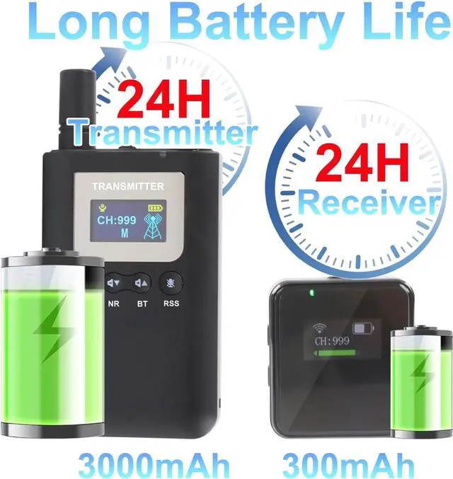 Extended Battery Life: The transmitter is equipped with a 3000mAh rechargeable battery, which can continuous use for 24 hours of use, while receivers have 300mAh battery, which can continuous use up to 24 hours of use.