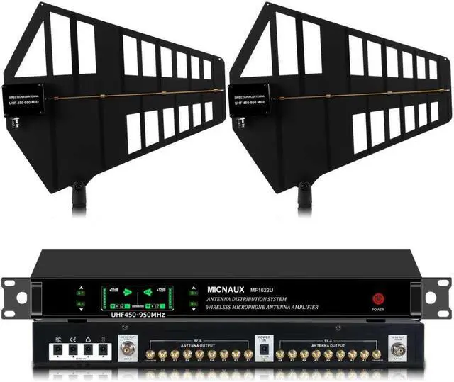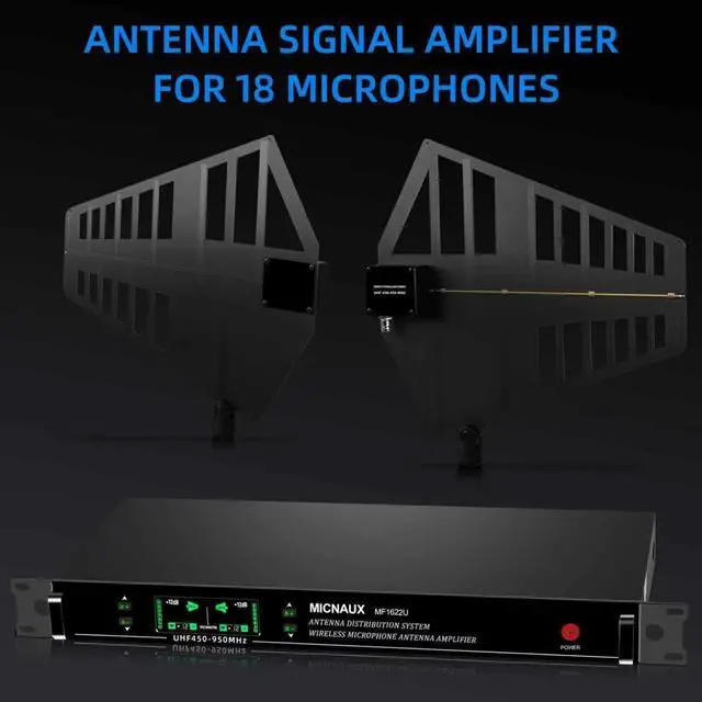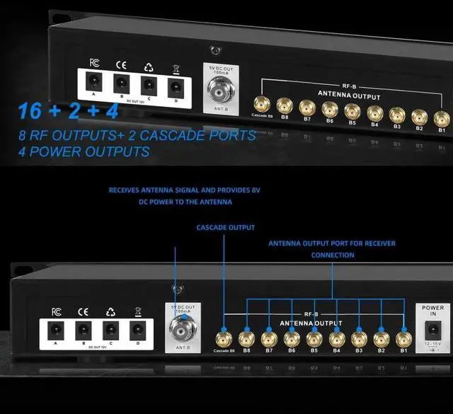 Multi-Receiver Compatibility: Featuring 16 RF outputs and 2 cascade ports, the system supports up to 9 dual-channel wireless receivers. Cascade ports also allow easy connection to another antenna distribution amplifier for large-scale setups.