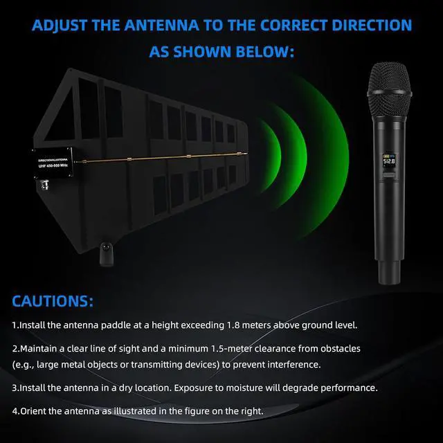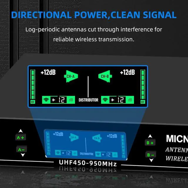 Stable Long-Distance Signal with Dual Antennas: Equipped with high-gain directional paddles and dual antenna design, the system delivers reliable reception even in challenging environments. The unique exhaust-air structure prevents antennas from falling under strong wind, ensuring secure placement during live events. With 360° coverage and adjustable 012 dB gain, microphone transmission remains stable up to 984 ft (300 m), minimizing interference and dropouts.