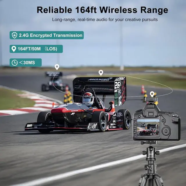 [164 Feet Stable Transmission] Experience seamless audio with this portable microphone's encrypted 2.4GHz transmission and sync encoder technology. Enjoy a solid connection up to 50 meters (164 feet) within line of sight, with ultra-low latency of less than 30ms. Ideal for video recording, livestreaming, podcasting, outdoor filming, and online teaching, ensuring your audio stays crisp and in sync