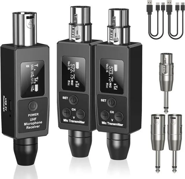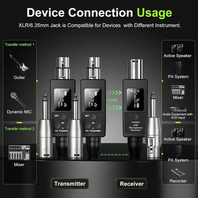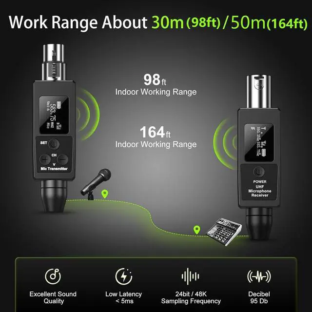 FOR DYNAMIC MICROPHONES & AUDIO SOURCES: The wireless XLR adapter system is compatible with any dynamic mic and comes with a 6.35mm adapter for other sources. is suitable for live performance, venues, weddings, speech,party,vocal concert,band rehearsal, content creator, etc.