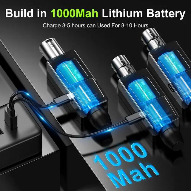 Durable Rechargeable Battery: Both the wireless microphone transmitter and receiver feature built-in 1000mAh rechargeable lithium batteries, offering 5-8 hours of operation with just a 2-3-hour full charge. The included 2-in-1 charging cable allows simultaneous charging of both the transmitter and receiver.