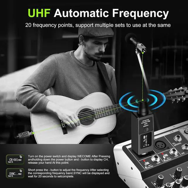 20 Adjustable Channels:The portable wireless mic system offers 20 frequency, allowing you to use up to 20 sets of devices simultaneously without interference. Use Multiple Sets At the Same Time: Channel Lock:Holding down the power button and - button to display CH, release your hand At this polint.you will enter the FM settings. Short press the - button to adjust the frequency Afterselecting the corresponding frequency band,SYNC will be displayed and wait for 20 seconds to setcomplete.