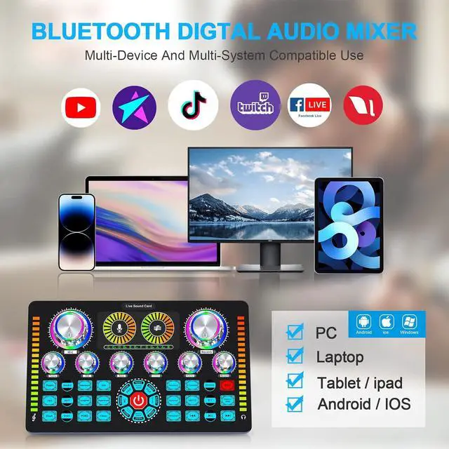 Q7 Audio console is an entertaining sound card, designed for webcast live streaming and podcasting, but the sound quality of the Q7 sound card might not be as good as a professional DJ mixer.ot compatible with USB microphone.