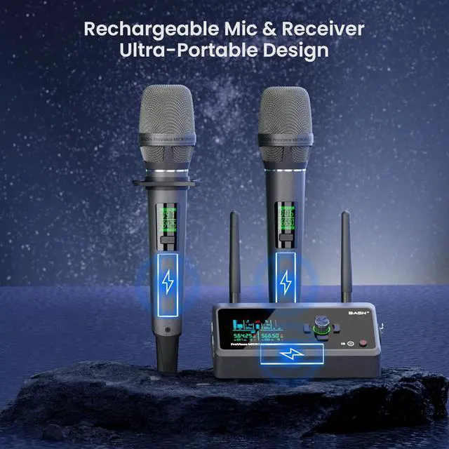 : Dual handheld wireless mics engineered with dual-layer pop filter and DSP chip for crisp vocals and deep bass. Universal compatibility mic system ideal for backyard barbecues, beach bonfires, camping parties, outdoor weddings, and all your al fresco adventures