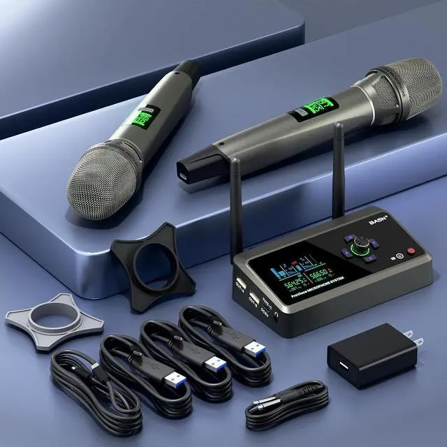 - : This basn handheld microphones kits built-in rechargeable battery (10H receiver/6H mic runtime) + USB-C charging for continuous use, this universal compatibility mic system perfect for all-day shoots or events and keeps you ready for any performance