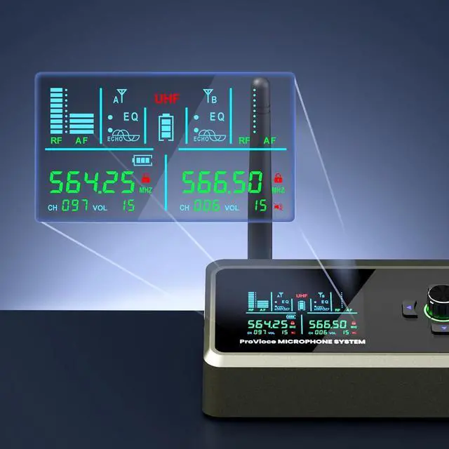 - & -: Professional mics set design with UHF frequency and 2x100 adjustable channels ensures interference-free transmission. Hyper-cardioid capsules and auto-clean channel search eliminate noise for studio-quality sound