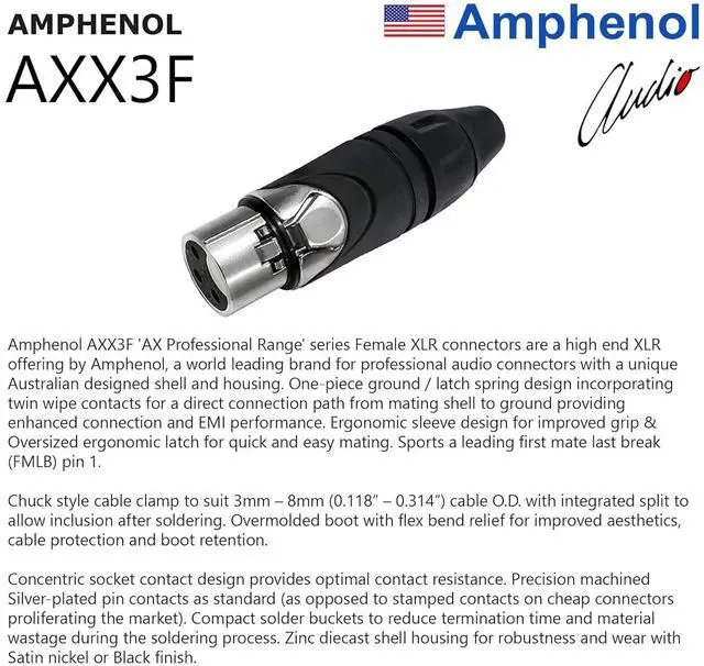 We use the highest-grade, premium Amphenol XLR connectors in this assembly for the ultimate value. AX3M & AXX3F are high end XLR offerings by Amphenol, the AX (Professional) series has great reliability, improved contact integrity & reduced cable strain. The connectors come in a Satin Nickel finished Zinc diecast Shell, Silver-plated contacts, & the AX3M has Machined contacts for superior performance (as opposed to stamped contacts on cheap connectors proliferating the market).