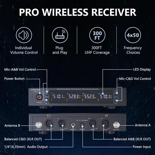 4x50 ADJUSTABLE FREQUENCIESEach channel has 50 adjustable frequency groups for this microphone set in UHF 510-590MHz band, allowing multiple sets to use at the same time without interference. Operating distance is up to 300ft in open space line of sight.