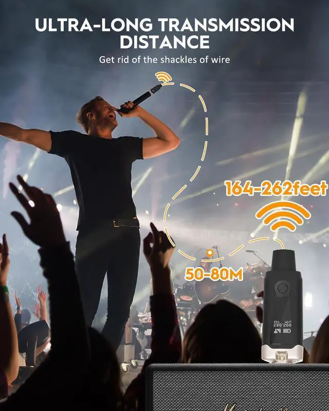 Ultra Long Distance Transmission: UHF band is optimal for microphone wireless, solid RF connection over a 164 - 262 feet rangenormal, uncompressed wireless signal transmission, low noise, and latency. Up to 110 dB signal-to-noise ratio provides clear, detailed audio at any volume. High-resolution 24-bit / 48kbps audio. Broad 40Hz - 20KHz frequency response.