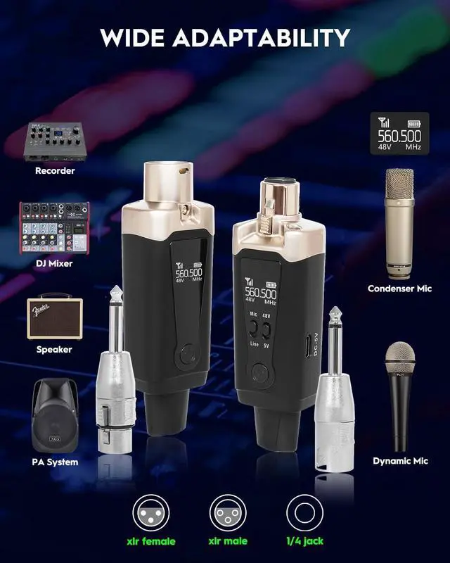 Metal XLR Interface: Connect various devices more firmly and stably, such as microphones, speakers, mixers, and PA systems. Comes with an XLR to 1/4 adapter, allowing the M2 wireless XLR microphone transmitter-receiver to be widely used in different usage scenarios.