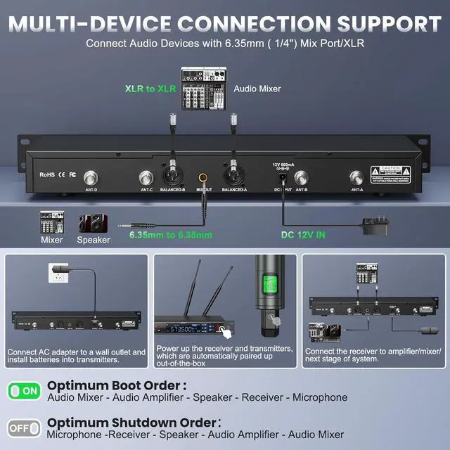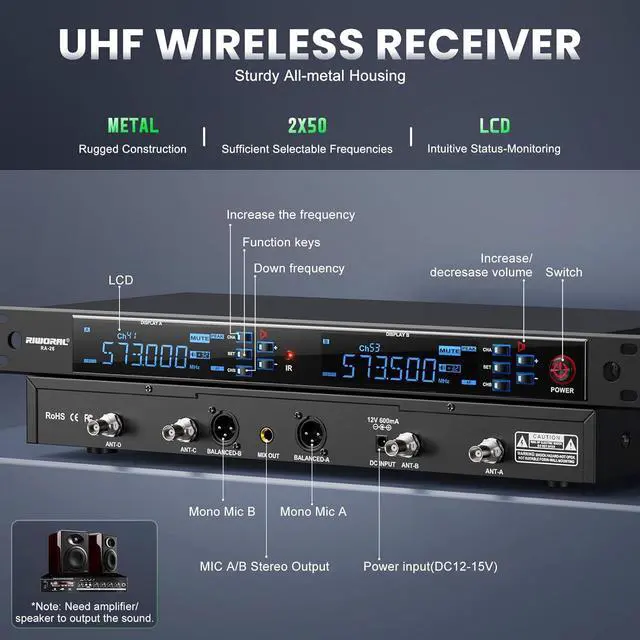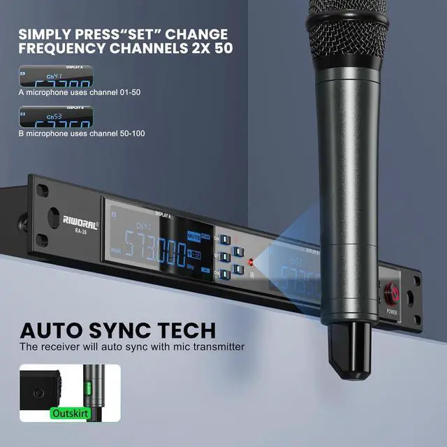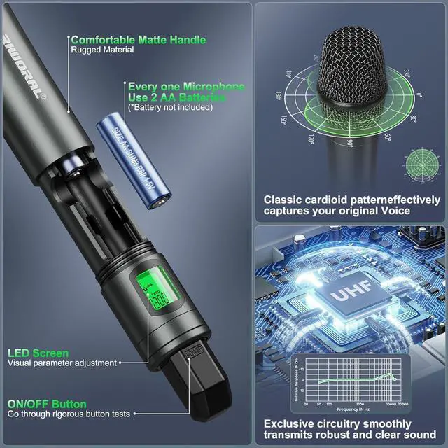 CABLE-FREE TRANSMISSION & EASY SETUP: Wireless karaoke microphone with mono 2 XLR and stereo 1/4 outputs offers flexible connections and 50 UHF frequency groups for multiset operation. Informative LCD screens of the wireless DJ microphone system enable users to visualize system frequency, battery life, and pairing status easily.