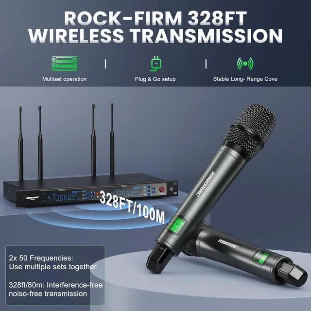 PREMIUM WIRELESS PERFORMANCE: UHF wireless microphone & system with selectable frequency. Channel A: 560-585Mhz (50 channels).Channel B:585.5-599.5MHz(50 channels).Employs hassle-free IR synchronization to pair up the receiver and cordless mics smoothly within seconds, minimum dropouts, and maximum feedback rejection. Long range operation for wireless DJ microphone system of 300ft 328ft line of sight.