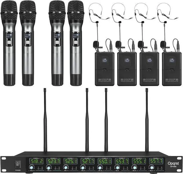 Durable and fashionable styleThe receiver features eight XLR balanced outputs and one 1/4" (6.35mm) mix output jack, which automatically pairs with the transmitter for easy plug-and-play setup. High sensitivity ensure the clarity of voice. Large diameter moving coil pickup head effectively prevent whistling noise. Require for 2*1.5V AA batteries, please note that they are excluding in the package.Wireless microphone receiver and wireless handheld microphone both have high-end LCD display, battery usage and working status at a glance.