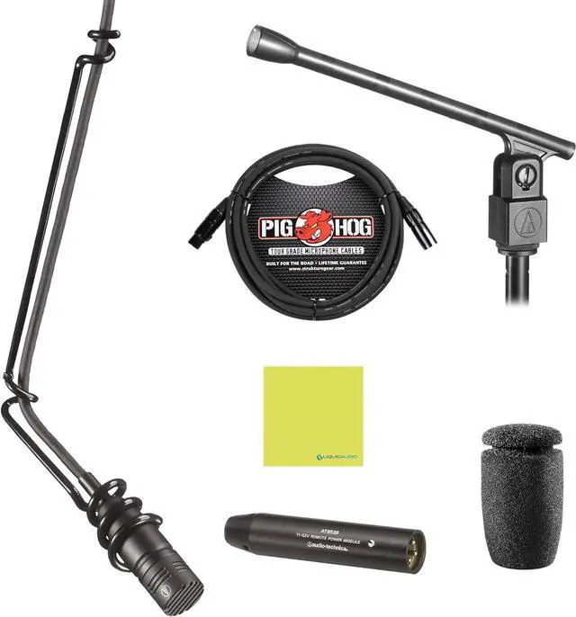 INCLUDES - Audio Technica U853R Cardioid Condenser Hanging Microphone Bundle, AT8153 Two-stage Foam Windscreen, AT8438 Steel Hanger and Polishing cloth offering all the essential components for professional-grade hanging microphone setups with convenience and versatility.