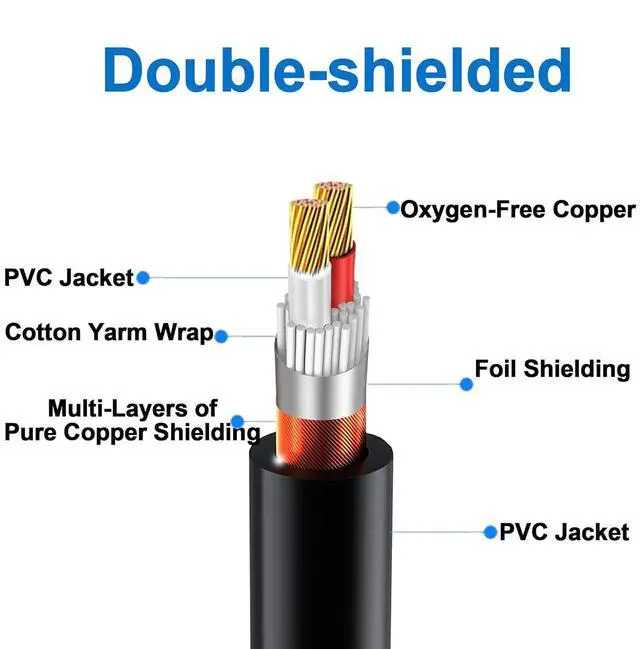 High-quality materials Cable Heavy Duty Flexible PVC Jacket Protect Your Cable, the outer diameter of the cable is 6.0mm(0.24 inch),high durability. The thick copper braid is highly elastic. Cotton Yarn wrap reduces noise. made by environment-friendly material, Polyethylene insulation improves high frequency response,strong, flexible .