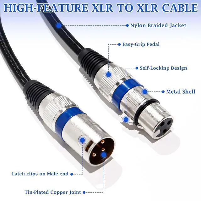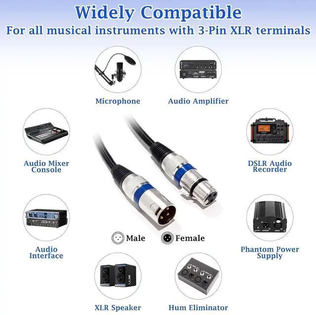 Wide CompatibilityBuilt with high quality XLR audio cable male to female connector, our xlr to xlr cable is compatible 3-pin XLR connectors such as microphones, studio harmonizers, mixing boards, patch bays, preamps, speaker systems, stage lighting, etc. Widely used at Stage Sound, KTV, Professional Sound Reinforcement, Home Theater and other environment.