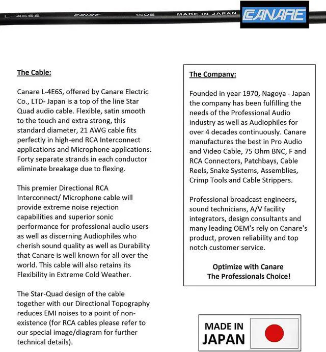 Based in Nagoya-Japan, Canare manufactures Cables, Tools & Acc. for Pro-Audio/Video applications since 1970. Many Audio-Professionals rely on Canares proven reliability, top-notch quality & customer service. Optimize with Canare, the Professionals Choice!